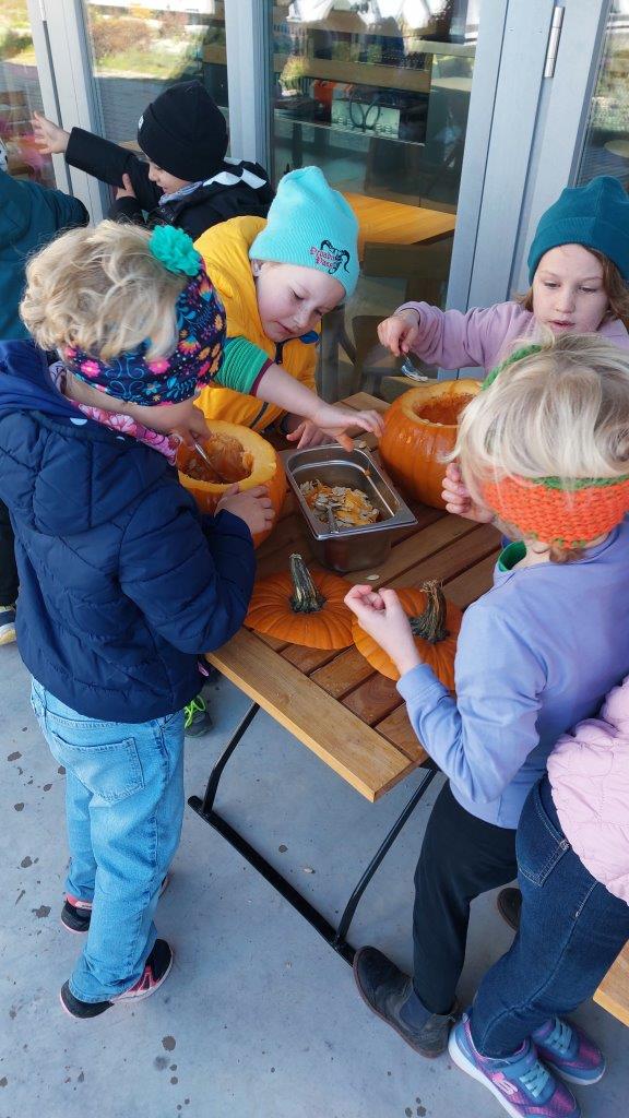 Anschließend war die Kreativität der Schüler gefragt. Partnerweise höhlten die Kinder die Kürbisse aus – eine Aufgabe, die sichtlich Spaß machte – und zeichneten dann gruselige, aber auch lustige Gesichter auf die Schale. Damit die Kunstwerke sicher waren, sprangen die Erwachsenen ein und schnitzten die vorgezeichneten Motive heraus.