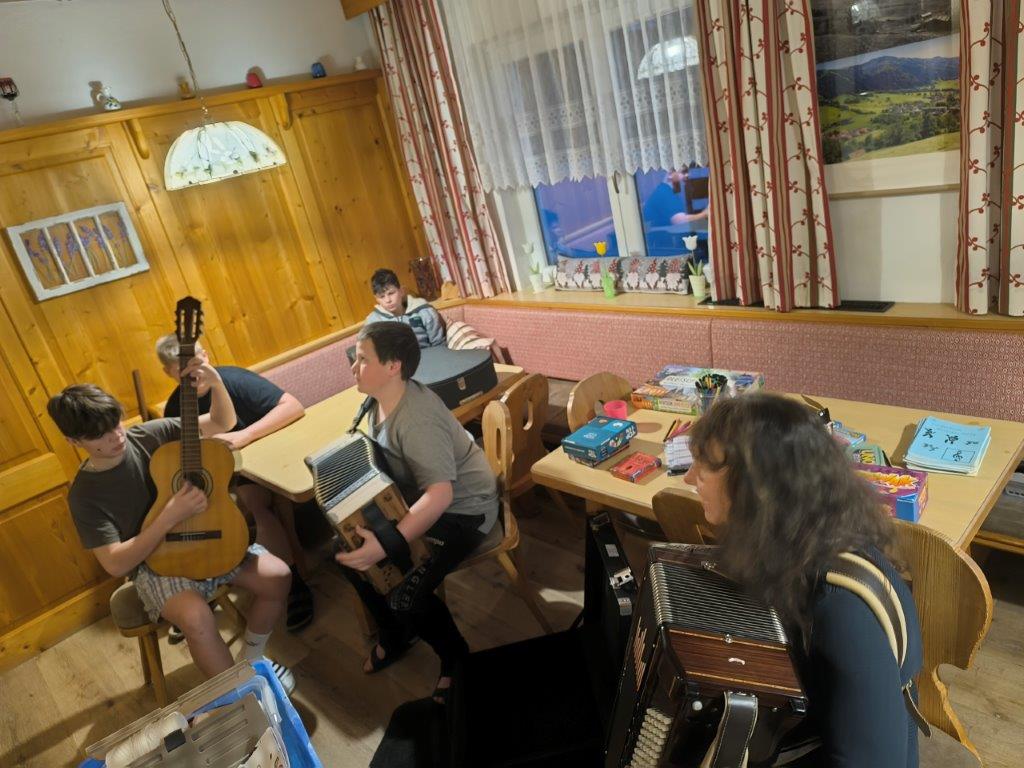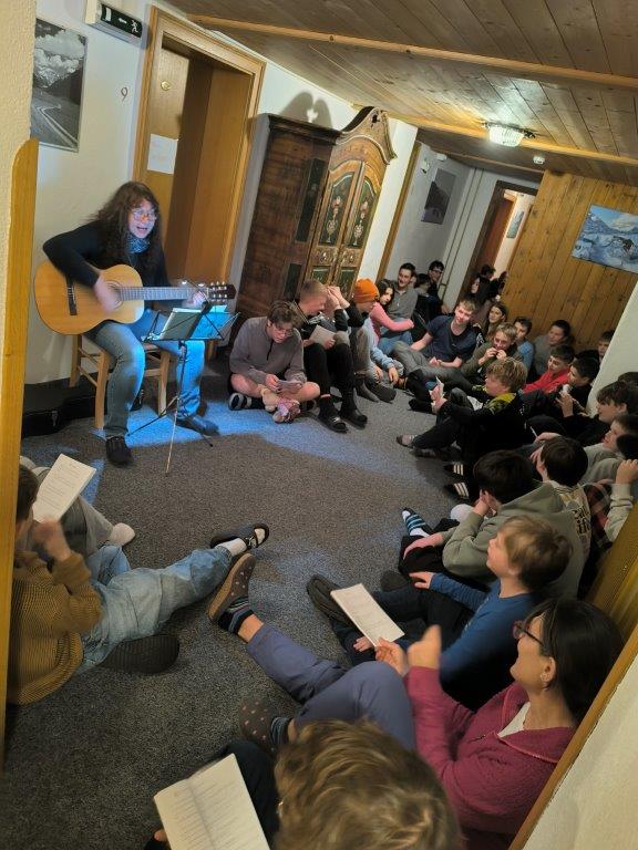 Nach dieser Anstrengung freuten sich alle auf das leckere Abendessen, das von unseren Wirtsleuten in bewährter Art und Weise zubereitet wurde. Anschließend gab es immer einen gemeinsamen Spieleabend, bei dem die Kinder merkten, dass man sich auch einmal sehr gut ohne Handy beschäftigen kann. Am Dienstag schaute Frau Janiczek vorbei, um mit uns beim gemeinsamen Liederabend Wolfgang Ambros’ Hymne “Skifoan” zu schmettern.