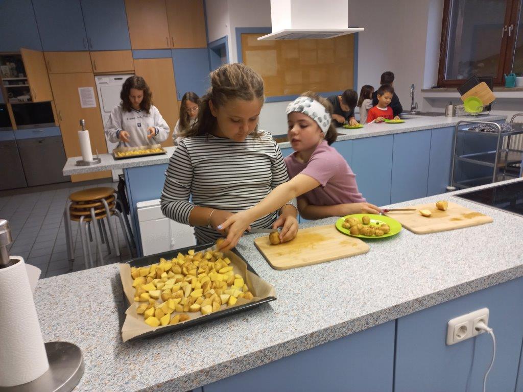 Nach der Ernte wurden die Kartoffeln gewaschen, geschält und in Stücke geschnitten. Dann kamen sie in den Ofen – natürlich gemeinsam mit etwas Öl und Gewürzen. Dazu bereiteten wir einen leckeren Dip zu.